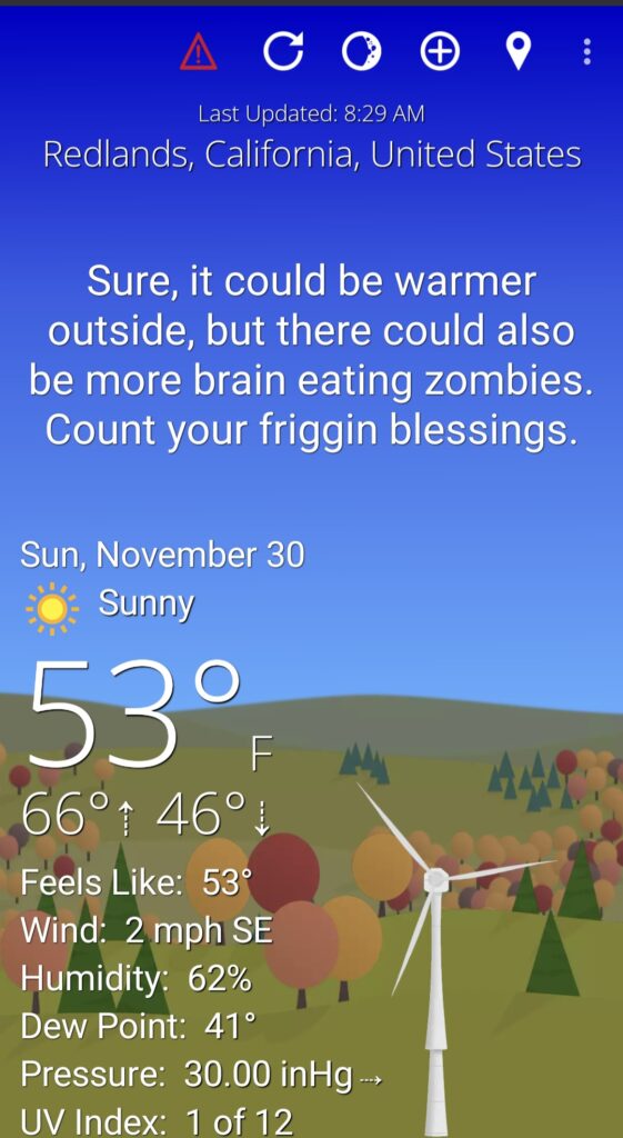 I recently went over to the dark side when I dumped my Apple iPhone in favor of a Samsung Galaxy, causing me to have to find a different weather forecasting app. I looked at a bunch and went with Night Cat Production’s WTForecast app because it’s pretty accurate for my location, and the ads are fairly unobtrusive. Plus, it makes me laugh from time to time.